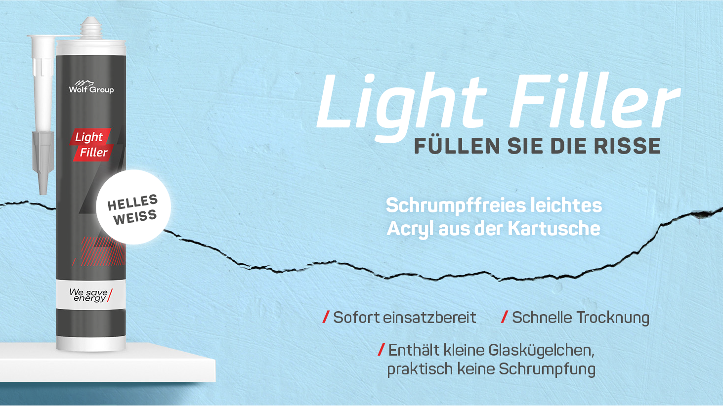 Die F&E-Abteilung der Wolf Group hat ein neues und innovatives Produkt entwickelt: einen leichten, gebrauchsfertigen Acrylspachtel, der aus Millionen kleiner Glaskügelchen besteht. Dieses buchstäbliche Leichtgewicht ist fünfzig Prozent leichter als ein normaler Filler aus der Kartusche. Wer würde nicht gerne weniger schleppen müssen und schneller arbeiten? Neben den Vorteilen der einfach zu handhabenden Kartusche oder Tube macht die spezielle Formel des Light Fillers dieses Produkt zudem praktisch schrumpffrei. Der Light Filler klumpt nicht, und es ist nicht nötig, Schichten aufzubauen oder ihn mehrfach aufzutragen. Die Dichte des Light Fillers beträgt 0,62 g/ml und er wird nach dem Aushärten nicht spröde. Das Produkt hat die CE-Kennzeichnung EN 13963: 1A.