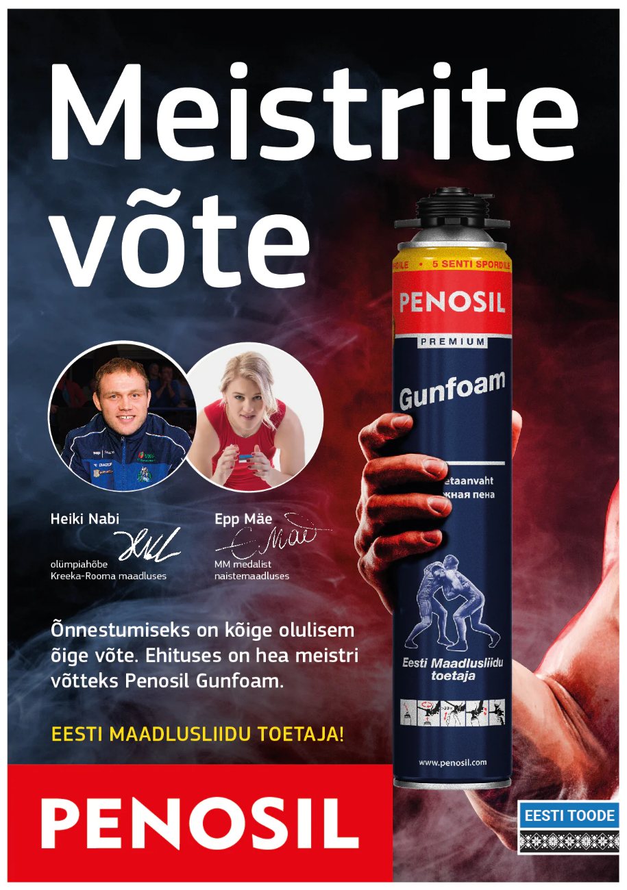 Für unsere Ringer-Sponsoring-Kampagne wurden ein speziell entwickelter Bauschaum (PENOSIL Premium Gunfoam), ein Acryl-Dichtstoff (PENOSIL Premium Acrylic Sealant), ein Silikon (PENOSIL Premium Universal Silicone) und ein Hybrid-Klebstoff (PENOSIL Premium SpeedFix High Tack) auf den Markt gebracht. Fünf Cent aus dem Verkauf jedes dieser Produkte gehen an die Ringkampf-Promotion. 2018 wurden die Produkte mit dem EV100-Stempel versehen: Das Sortiment war ein Geschenk zum 100-jährigen Bestehen der Republik Estland.