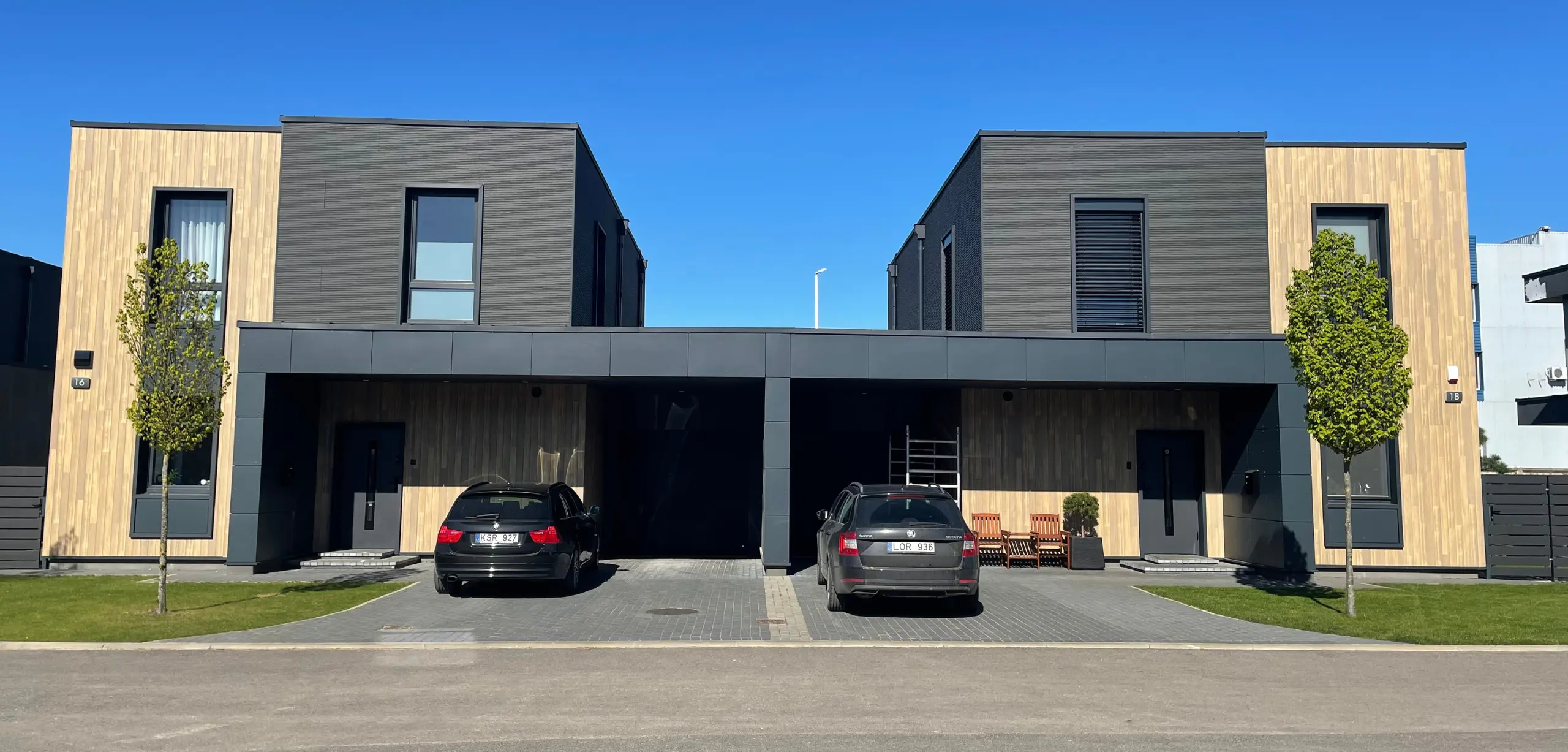 El complejo de viviendas privadas Oak House (Ąžuolio namai) en el distrito de Kaunas se basa en la idea de crear casas de dos pisos energéticamente eficientes. Cada una de las dos casas unifamiliares forma un lote.