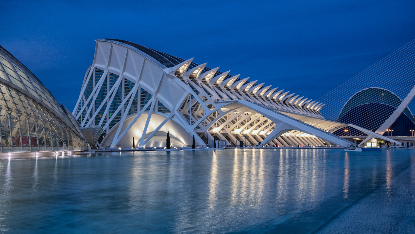 La Ciudad de las Artes y las Ciencias es un complejo arquitectónico, cultural y de ocio de Valencia. El complejo se organiza en torno a un eje, formando una entidad propia en la que se distribuyen l’Hemisfèric, el Palacio de las Artes, el Museo Príncipe Felipe y l’Oceanogràfic. El uso del hormigón blanco en todo el complejo en los diferentes edificios, así como el trencadís blanco y azul en el revestimiento del espacio público, dan unidad a todo el proyecto. En toda la obra de Calatrava, las formas ganan dinamismo con el uso de grandes superficies acristaladas. Iluminadas desde el interior durante las horas nocturnas, se convierten en una fuente de iluminación interior en constante evolución durante el día. Esta estructura actúa como una fuente de luz, diseñada para maximizar la cantidad de luz que entra en el edificio. Los elementos estructurales, numerosos y colocados cerca unos de otros, pueden evocar con sus sombras los árboles de un bosque y ser una metáfora más de la naturaleza.