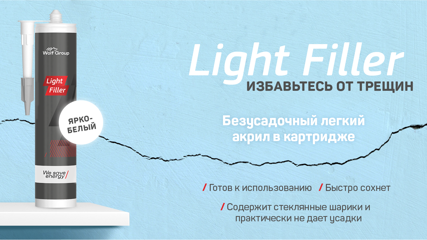Компания Wolf Group разработала новый инновационный продукт — легкую, готовую к использованию акриловую шпатлевку, содержащую миллионы стеклянных шариков. Она в буквальном смысле легкая — на пятьдесят процентов легче, чем обычная шпатлевка в картридже. Кто не хотел бы таскать меньше тяжестей и выполнять работу быстрее? Light Filler практически не дает усадки благодаря специальной формуле и удобно фасуется в картриджи или колбаски. Light Filler не образует комочков и не требует нанесения в несколько слоев. Плотность легкой шпатлевки Light Filler составляет 0,62 г/мл, и она не остается хрупкой после отверждения.  Легкая шпатлевка получила маркировку CE в соответствии со стандартом EN 13963: 1A.
