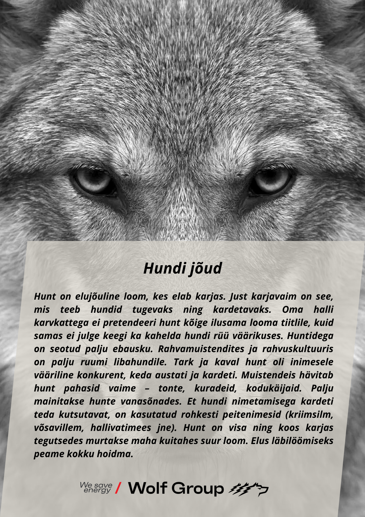Koostöö. Alati leidub lahendus. Jahipidamine on meie DNA. Piiriks on vaid taevas. Tunneme rõõmu. Hoolime loodusest. Tõeline hunt jätab jälje.