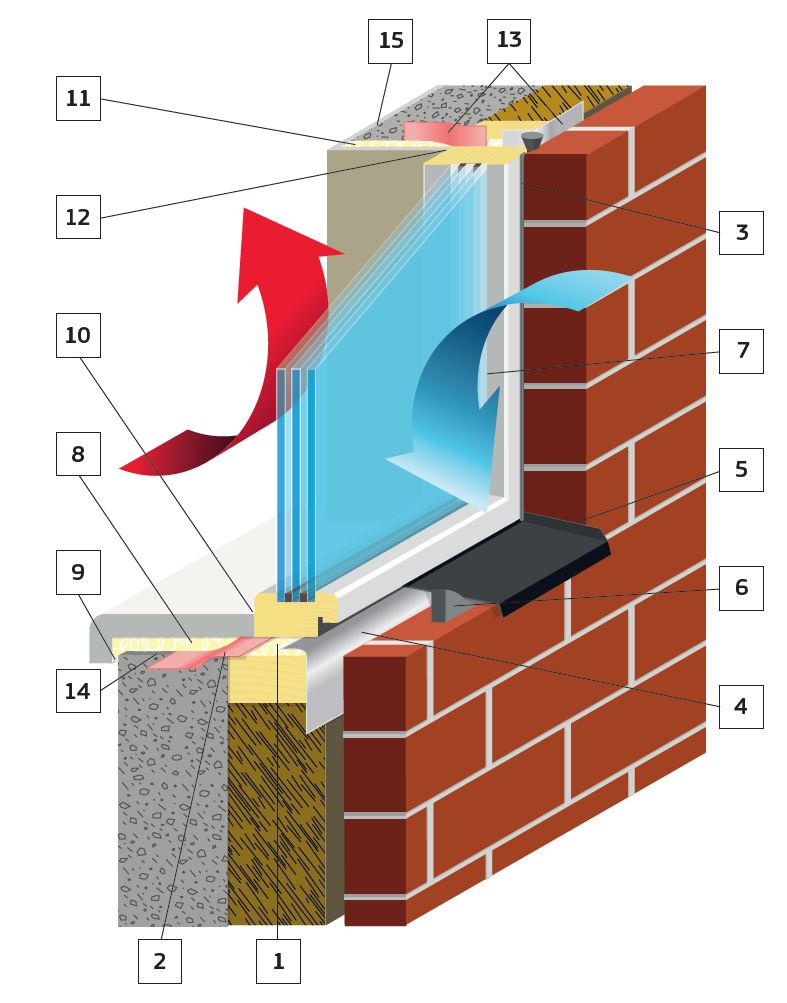 - Sumažinkite šilumos nuostolius iki minimumo. Langų jungtims naudokite mažiausiai šilumos laidumo medžiagas, pvz., PU statybines putas. Be to, šilumos laidumo nuostoliai priklauso nuo jungčių gylio, pvz., langams su plačiais rėmais jie yra mažesni dėl didesnio jungties gylio.