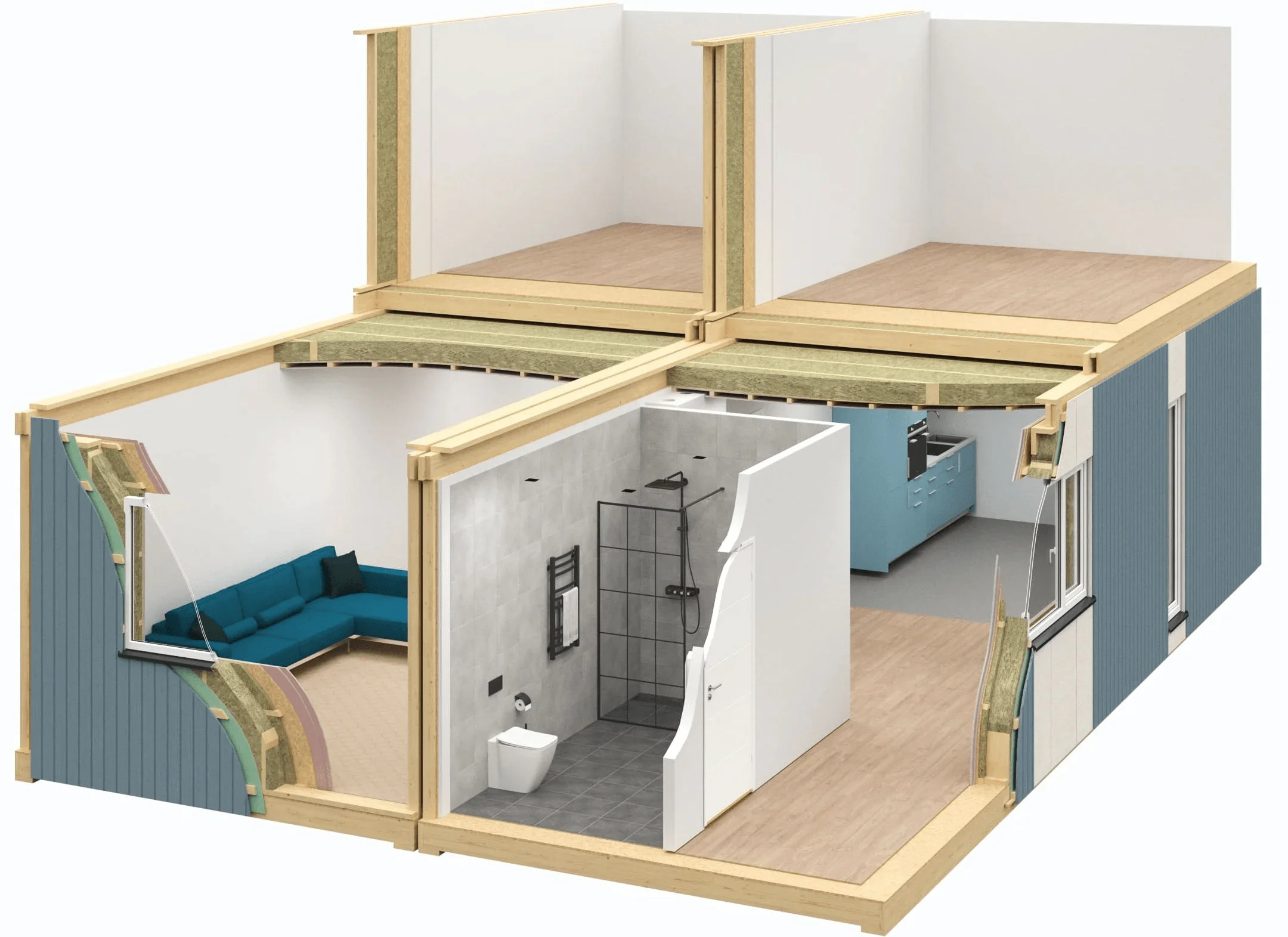 Wolf Group sukūrė specializuotus sprendimus ir produktus, skirtus būtent modulinių namų gamintojams. Mūsų interneto puslapyje spustelėjus konkretų sprendimą, atidaromi išsamūs brėžiniai, leidžiantys lengvai identifikuoti kiekvienai sričiai tinkamus produktus su technine informacija, dokumentacija ir reikiamais sertifikatais. Dauguma šių produktų yra įtraukti į modulinių namų eksporto rinkoms būtinus registrus ir turi reikiamus mažos emisijos sertifikatus EC1 Plus ir M1.