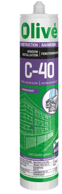 Olivé C-40 vieno komponento, žemo modulio, aukštos kokybės neutralus alkoksi silikonas, kuris reaguodamas su aplinkoje esančia drėgme ir sukuria itin lanksčią jungtį.