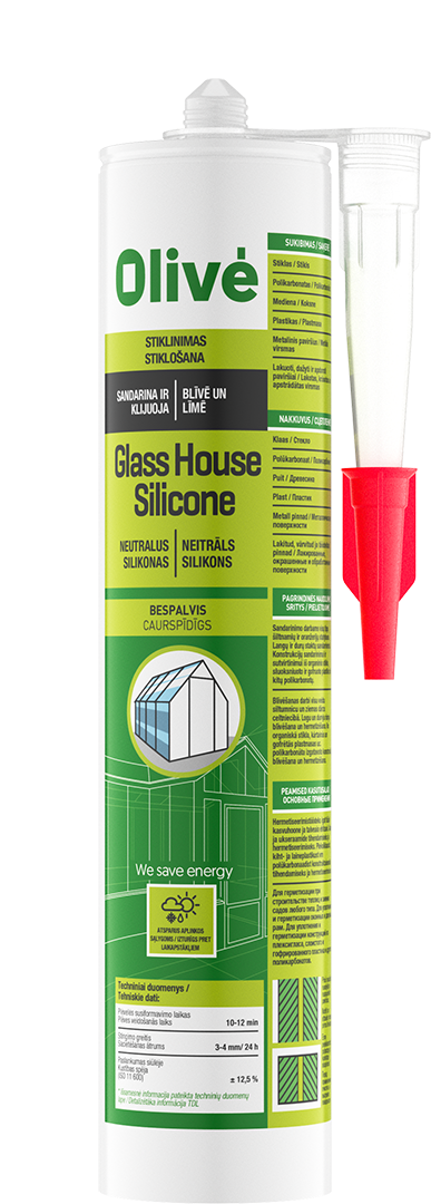 Olivé Glass House Silicone neutralus silkonas visų rūšių šiltnamiams, atsparus oro sąlygoms ir pelėsiui.