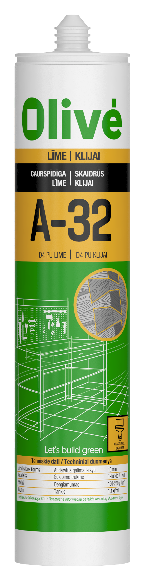 Olivé A-32 ir vienkomponenta, poliuretāna, caurspīdīga līme, kas sacietē mitruma klātbūtnē.