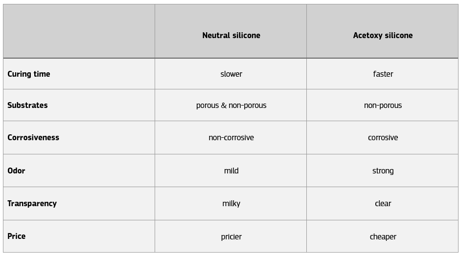 A few types of silicones are used in construction, but the two most important are neutral and acid-cure silicones. For many people, the difference between neutral and acetoxy silicone is simply in the smell. Neutral cure silicones emit very little odour, making them ideal for indoor applications, whereas acid-cure silicones have a stronger vinegar-like smell. However, there are more properties to consider and requirements to fulfil when choosing the right type of silicone, such as mechanical properties, product stability, the emission of volatile organic compounds (VOC), etc. When in doubt about which curing system to use prefer neutral silicones.